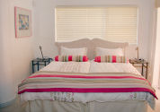 Two master en-suite bedrooms have doors which open onto a sunny inner courtyard. Each room has two single beds pushed together, dressed with cotton linen. Guests are supplied with luxury bath and swimming towels. Linen and towels are changed weekly for guests staying longer than seven days.