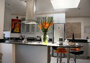 In the open plan living area, the kitchen with breakfast counter and bar stools is a chef's dream. Superbly fitted in granite and stainless steel, it is equipped with prep bowl and sink, dishwasher, kettle, coffee machine, toaster, stove with electric oven and gas and electric hobs, microwave, combination fridge and freezer, and cutlery, crockery and glassware for eight people. There is also a washing